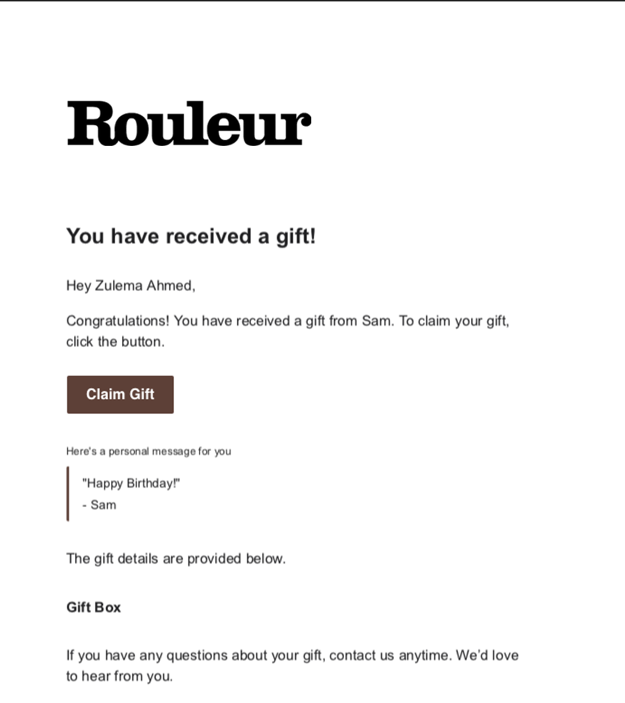 Una vez recibido, el destinatario recibirá un correo electrónico de Rouleur en unas pocas horas, el destinatario debe entonces seleccionar Reclamar Regalo.